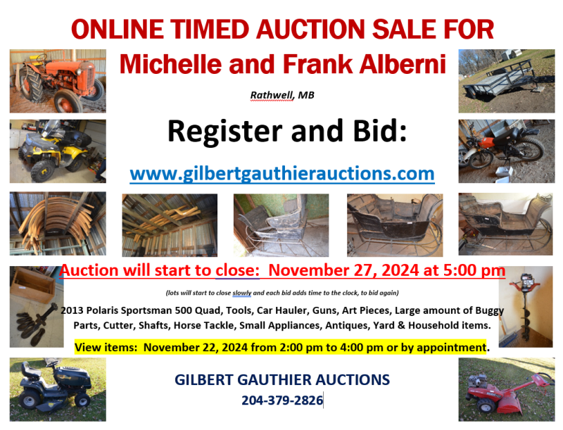 Gilbert Gauthier Auctions is a premier online auction house based in St Claude, Manitoba, specializing in a wide variety of items, from rare antiques to modern electronics. With years of experience in the auction industry, our mission is to provide a seamless and transparent online bidding experience for both buyers and sellers. Our platform is designed with the user in mind, offering a simple, secure, and efficient way to participate in auctions from the comfort of your home. Whether you're looking to discover your next treasure or sell an item at the best possible price, Gilbert Gauthier Auctions is your trusted partner.
